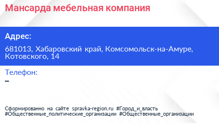 Мансарда, мебельная компания по адресу 681013, Хабаровский край, Комсомольск-на-Амуре, Котовского, 14 в дальнейшем Организация, размещена в следующих категориях: