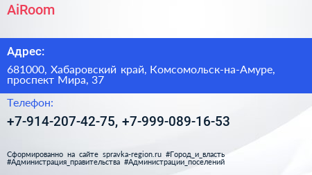 AiRoom по адресу 681000, Хабаровский край, Комсомольск-на-Амуре, проспект Мира, 37 в дальнейшем Организация, размещена в следующих категориях: