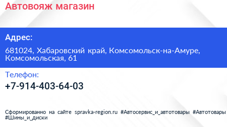 Автовояж, магазин по адресу 681024, Хабаровский край, Комсомольск-на-Амуре, Комсомольская, 61 в дальнейшем Организация, размещена в следующих категориях: