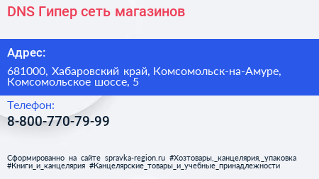 DNS Гипер, сеть магазинов по адресу 681000, Хабаровский край, Комсомольск-на-Амуре, Комсомольское шоссе, 5 в дальнейшем Организация, размещена в следующих категориях: