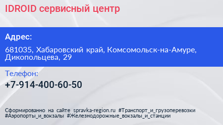 IDROID, сервисный центр по адресу 681035, Хабаровский край, Комсомольск-на-Амуре, Дикопольцева, 29 в дальнейшем Организация, размещена в следующих категориях: