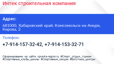 Интек, строительная компания по адресу 681000, Хабаровский край, Комсомольск-на-Амуре, Кирова, 2 в дальнейшем Организация, размещена в следующих категориях: