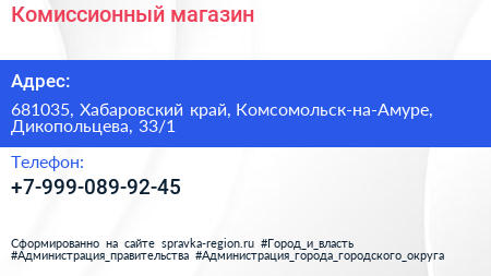 Комиссионный магазин по адресу 681035, Хабаровский край, Комсомольск-на-Амуре, Дикопольцева, 33/1 в дальнейшем Организация, размещена в следующих категориях: