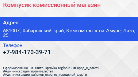 Компусик, комиссионный магазин по адресу 681007, Хабаровский край, Комсомольск-на-Амуре, Лазо, 25 в дальнейшем Организация, размещена в следующих категориях: