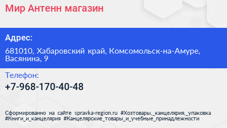 Мир Антенн, магазин по адресу 681010, Хабаровский край, Комсомольск-на-Амуре, Васянина, 9 в дальнейшем Организация, размещена в следующих категориях: