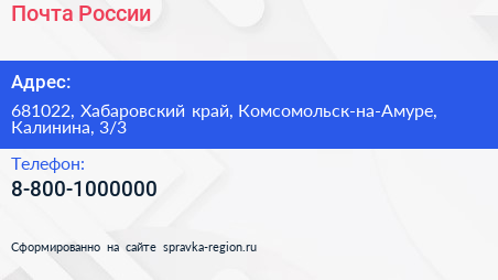 Почта России по адресу 681022, Хабаровский край, Комсомольск-на-Амуре, Калинина, 3/3 в дальнейшем Организация, размещена в следующих категориях: