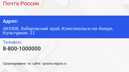 Почта России по адресу 681008, Хабаровский край, Комсомольск-на-Амуре, Культурная, 11 в дальнейшем Организация, размещена в следующих категориях:
