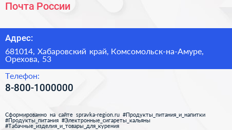Почта России по адресу 681014, Хабаровский край, Комсомольск-на-Амуре, Орехова, 53 в дальнейшем Организация, размещена в следующих категориях: