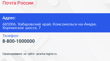 Почта России по адресу 681006, Хабаровский край, Комсомольск-на-Амуре, Хорпинское шоссе, 7 в дальнейшем Организация, размещена в следующих категориях: