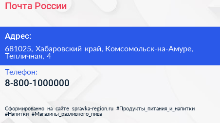 Почта России по адресу 681025, Хабаровский край, Комсомольск-на-Амуре, Тепличная, 4 в дальнейшем Организация, размещена в следующих категориях: