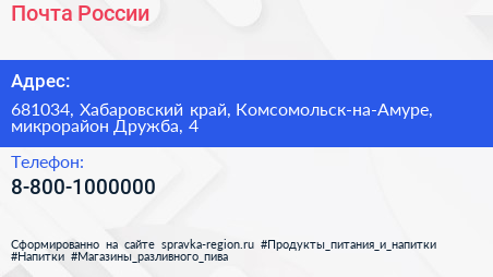 Почта России по адресу 681034, Хабаровский край, Комсомольск-на-Амуре, микрорайон Дружба, 4 в дальнейшем Организация, размещена в следующих категориях: