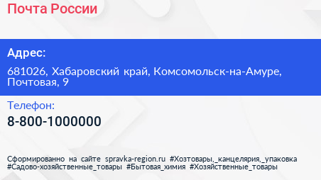 Почта России по адресу 681026, Хабаровский край, Комсомольск-на-Амуре, Почтовая, 9 в дальнейшем Организация, размещена в следующих категориях: