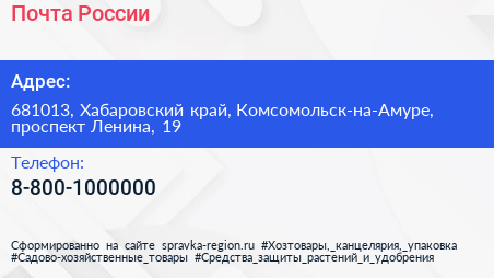 Почта России по адресу 681013, Хабаровский край, Комсомольск-на-Амуре, проспект Ленина, 19 в дальнейшем Организация, размещена в следующих категориях: