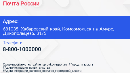 Почта России по адресу 681035, Хабаровский край, Комсомольск-на-Амуре, Дикопольцева, 31/5 в дальнейшем Организация, размещена в следующих категориях: