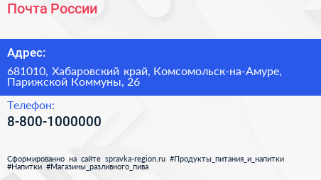 Почта России по адресу 681010, Хабаровский край, Комсомольск-на-Амуре, Парижской Коммуны, 26 в дальнейшем Организация, размещена в следующих категориях: