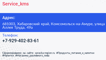 Service_kms по адресу 681003, Хабаровский край, Комсомольск-на-Амуре, улица Аллея Труда, 49а в дальнейшем Организация, размещена в следующих категориях: