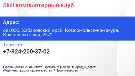 Skill, компьютерный клуб по адресу 681000, Хабаровский край, Комсомольск-на-Амуре, Краснофлотская, 25/2 в дальнейшем Организация, размещена в следующих категориях: