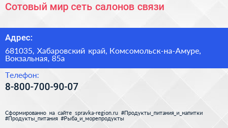 Сотовый мир, сеть салонов связи по адресу 681035, Хабаровский край, Комсомольск-на-Амуре, Вокзальная, 85а в дальнейшем Организация, размещена в следующих категориях: