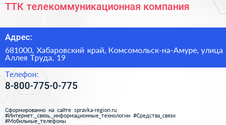ТТК, телекоммуникационная компания по адресу 681000, Хабаровский край, Комсомольск-на-Амуре, улица Аллея Труда, 19 в дальнейшем Организация, размещена в следующих категориях: