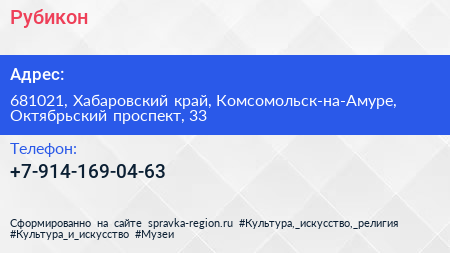 Рубикон по адресу 681021, Хабаровский край, Комсомольск-на-Амуре, Октябрьский проспект, 33 в дальнейшем Организация, размещена в следующих категориях: