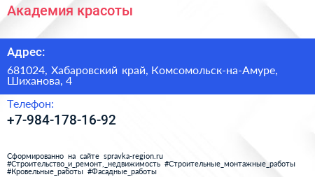 Академия красоты по адресу 681024, Хабаровский край, Комсомольск-на-Амуре, Шиханова, 4 в дальнейшем Организация, размещена в следующих категориях: