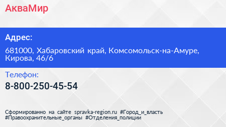АкваМир по адресу 681000, Хабаровский край, Комсомольск-на-Амуре, Кирова, 46/6 в дальнейшем Организация, размещена в следующих категориях: