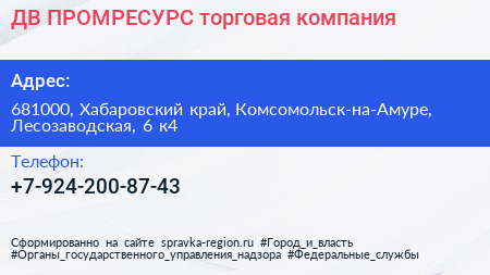 ДВ ПРОМРЕСУРС, торговая компания по адресу 681000, Хабаровский край, Комсомольск-на-Амуре, Лесозаводская, 6 к4 в дальнейшем Организация, размещена в следующих категориях: