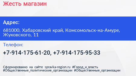Жесть, магазин по адресу 681000, Хабаровский край, Комсомольск-на-Амуре, Жуковского, 11 в дальнейшем Организация, размещена в следующих категориях: