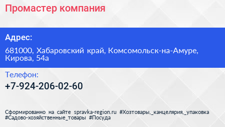 Промастер, компания по адресу 681000, Хабаровский край, Комсомольск-на-Амуре, Кирова, 54а в дальнейшем Организация, размещена в следующих категориях: