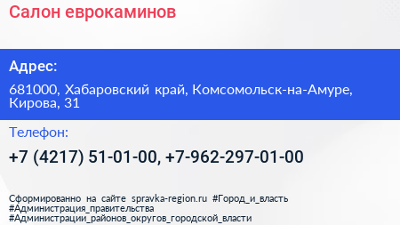 Салон еврокаминов по адресу 681000, Хабаровский край, Комсомольск-на-Амуре, Кирова, 31 в дальнейшем Организация, размещена в следующих категориях: