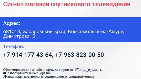 Сигнал, магазин спутникового телевидения по адресу 681013, Хабаровский край, Комсомольск-на-Амуре, Димитрова, 5 в дальнейшем Организация, размещена в следующих категориях:
