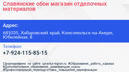 Славянские обои, магазин отделочных материалов по адресу 681035, Хабаровский край, Комсомольск-на-Амуре, Юбилейная, 8 в дальнейшем Организация, размещена в следующих категориях: