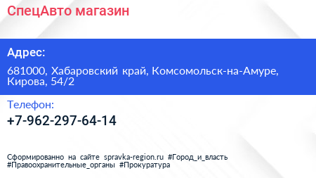 СпецАвто, магазин по адресу 681000, Хабаровский край, Комсомольск-на-Амуре, Кирова, 54/2 в дальнейшем Организация, размещена в следующих категориях: