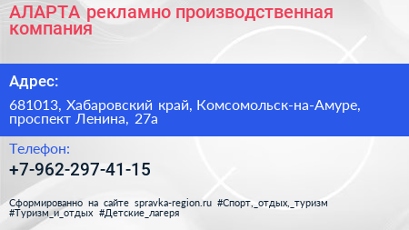 АЛАРТА, рекламно-производственная компания по адресу 681013, Хабаровский край, Комсомольск-на-Амуре, проспект Ленина, 27а в дальнейшем Организация, размещена в следующих категориях: