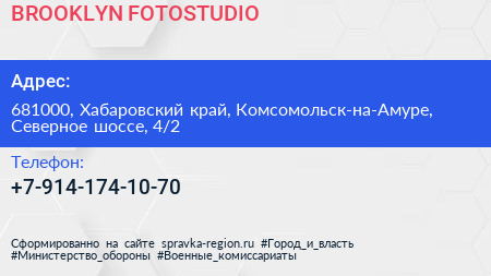 BROOKLYN FOTOSTUDIO по адресу 681000, Хабаровский край, Комсомольск-на-Амуре, Северное шоссе, 4/2 в дальнейшем Организация, размещена в следующих категориях: