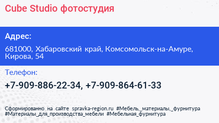 Cube Studio, фотостудия по адресу 681000, Хабаровский край, Комсомольск-на-Амуре, Кирова, 54 в дальнейшем Организация, размещена в следующих категориях:
