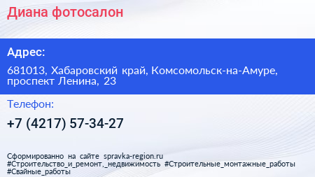 Диана, фотосалон по адресу 681013, Хабаровский край, Комсомольск-на-Амуре, проспект Ленина, 23 в дальнейшем Организация, размещена в следующих категориях: