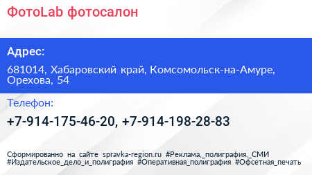ФотоLab, фотосалон по адресу 681014, Хабаровский край, Комсомольск-на-Амуре, Орехова, 54 в дальнейшем Организация, размещена в следующих категориях: