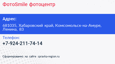ФотоSmile, фотоцентр по адресу 681035, Хабаровский край, Комсомольск-на-Амуре, Ленина, 83 в дальнейшем Организация, размещена в следующих категориях: