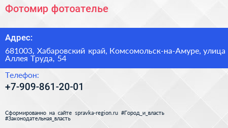 Фотомир, фотоателье по адресу 681003, Хабаровский край, Комсомольск-на-Амуре, улица Аллея Труда, 54 в дальнейшем Организация, размещена в следующих категориях: