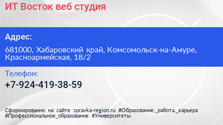 ИТ Восток, веб-студия по адресу 681000, Хабаровский край, Комсомольск-на-Амуре, Красноармейская, 18/2 в дальнейшем Организация, размещена в следующих категориях: