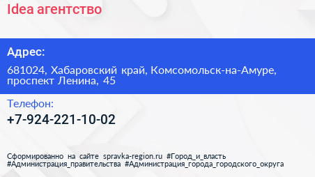 Idea, агентство по адресу 681024, Хабаровский край, Комсомольск-на-Амуре, проспект Ленина, 45 в дальнейшем Организация, размещена в следующих категориях: