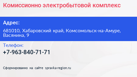 Комиссионно-электробытовой комплекс по адресу 681010, Хабаровский край, Комсомольск-на-Амуре, Васянина, 9 в дальнейшем Организация, размещена в следующих категориях: