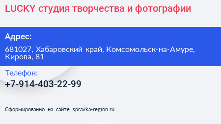 LUCKY, студия творчества и фотографии по адресу 681027, Хабаровский край, Комсомольск-на-Амуре, Кирова, 81 в дальнейшем Организация, размещена в следующих категориях: