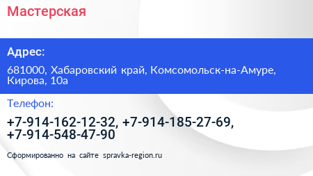 Мастерская по адресу 681000, Хабаровский край, Комсомольск-на-Амуре, Кирова, 10а в дальнейшем Организация, размещена в следующих категориях: