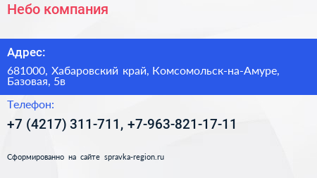Небо, компания по адресу 681000, Хабаровский край, Комсомольск-на-Амуре, Базовая, 5в в дальнейшем Организация, размещена в следующих категориях:
