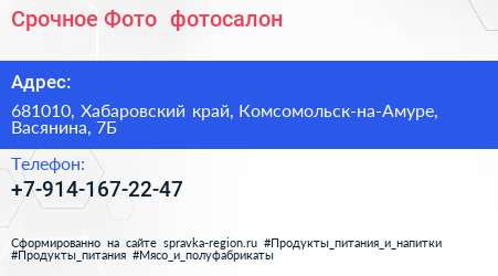 Срочное Фото+, фотосалон по адресу 681010, Хабаровский край, Комсомольск-на-Амуре, Васянина, 7Б в дальнейшем Организация, размещена в следующих категориях: