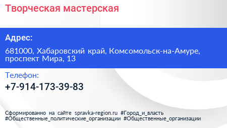 Творческая мастерская по адресу 681000, Хабаровский край, Комсомольск-на-Амуре, проспект Мира, 13 в дальнейшем Организация, размещена в следующих категориях: