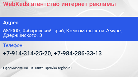 WebKeds, агентство интернет-рекламы по адресу 681000, Хабаровский край, Комсомольск-на-Амуре, Дзержинского, 3 в дальнейшем Организация, размещена в следующих категориях: