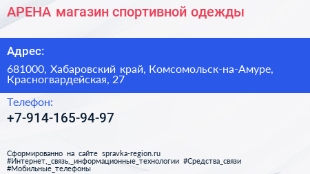 АРЕНА, магазин спортивной одежды по адресу 681000, Хабаровский край, Комсомольск-на-Амуре, Красногвардейская, 27 в дальнейшем Организация, размещена в следующих категориях: